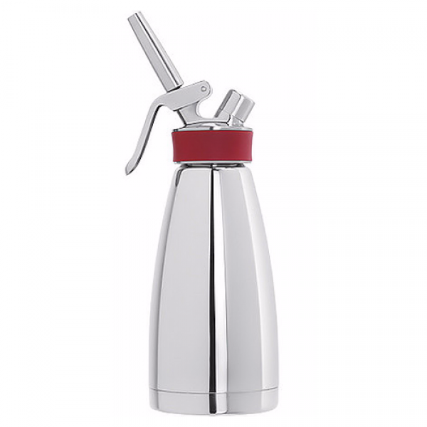 Stainless steel bottle and head designed for the professional use. Head with protective silicone grip and fixed stainless steel valve for easy dispensing, even with warm preparations.